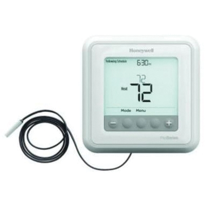 Honeywell Hydronic Thermostat, T6 PRO Series, 20 to 30 V, 0.02 to 1 A, 50/60 Hz Frequency, Programmability: 5-1-1 days Programmable, 5-2 days Programmable, 7 days Programmable, Battery, Hardwired Power Source, Up to 1 Heat Hot Water and Steam Stages, Switch Position: Heat-Off (System), Relay Switch, Large, Soft Key Control with LED Backlight Display, +/-1 deg F Differential, 40 to 90 deg F Settings, 37 to 102 deg F, 5 to 90% Non-Condensing Humidity, 1 deg F Accuracy, UWP System Mounting, White, Dimensions: 4-1/16 in L x 4-1/16 in W x 1-3/32 in D