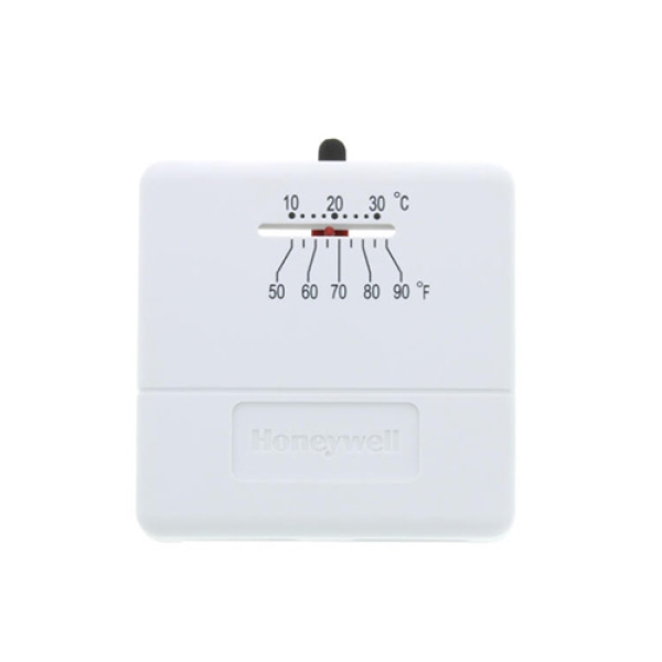 resideo Non-Programmable Thermostat, 18-30 V, 1 Heat Stages, Switch Position: SPST, Snap Action Switch, Bi-Metal Sensing Element, 50 to 90 deg F Settings, 5 to 90 % Humidity, Fan Current: 5 A, +/-3 deg F Accuracy, Heat Current: 2.5 A, Dimensions: 3-1/8 in H x 3-1/8 in W x 7/8 in D, Premier White