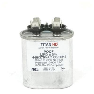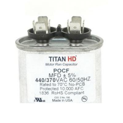 Packard Motor Single Run Capacitor, Series: POCF Series, 7.5 uF MFD Rating, 440 VAC, 50/60 Hz, Oval Shape, 60000 hr Average Life, +/-10 % Standard Tolerance, -40 to 70 deg C, Aluminum Case, 2.19 in Height, 2 in Width, 1-1/4 in D