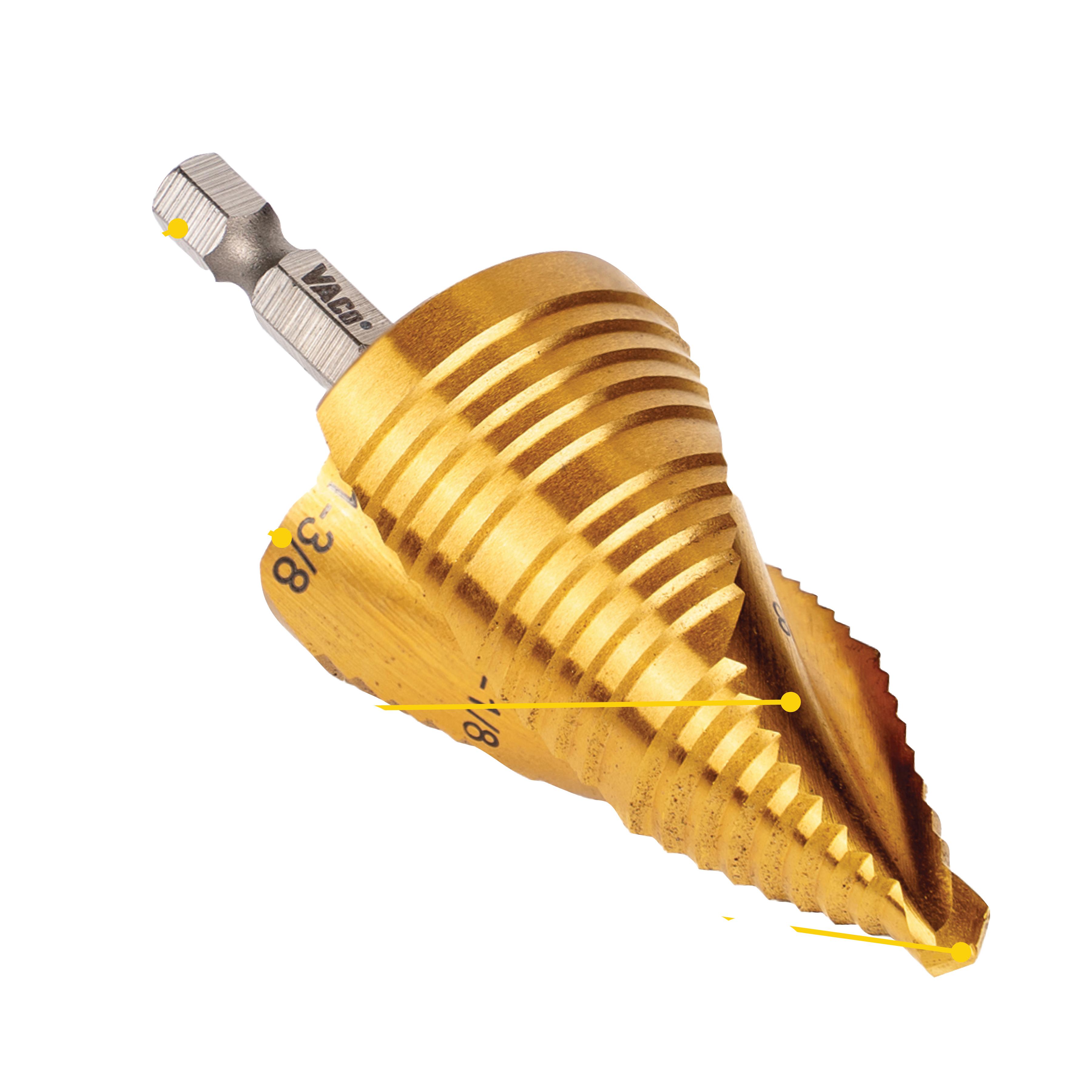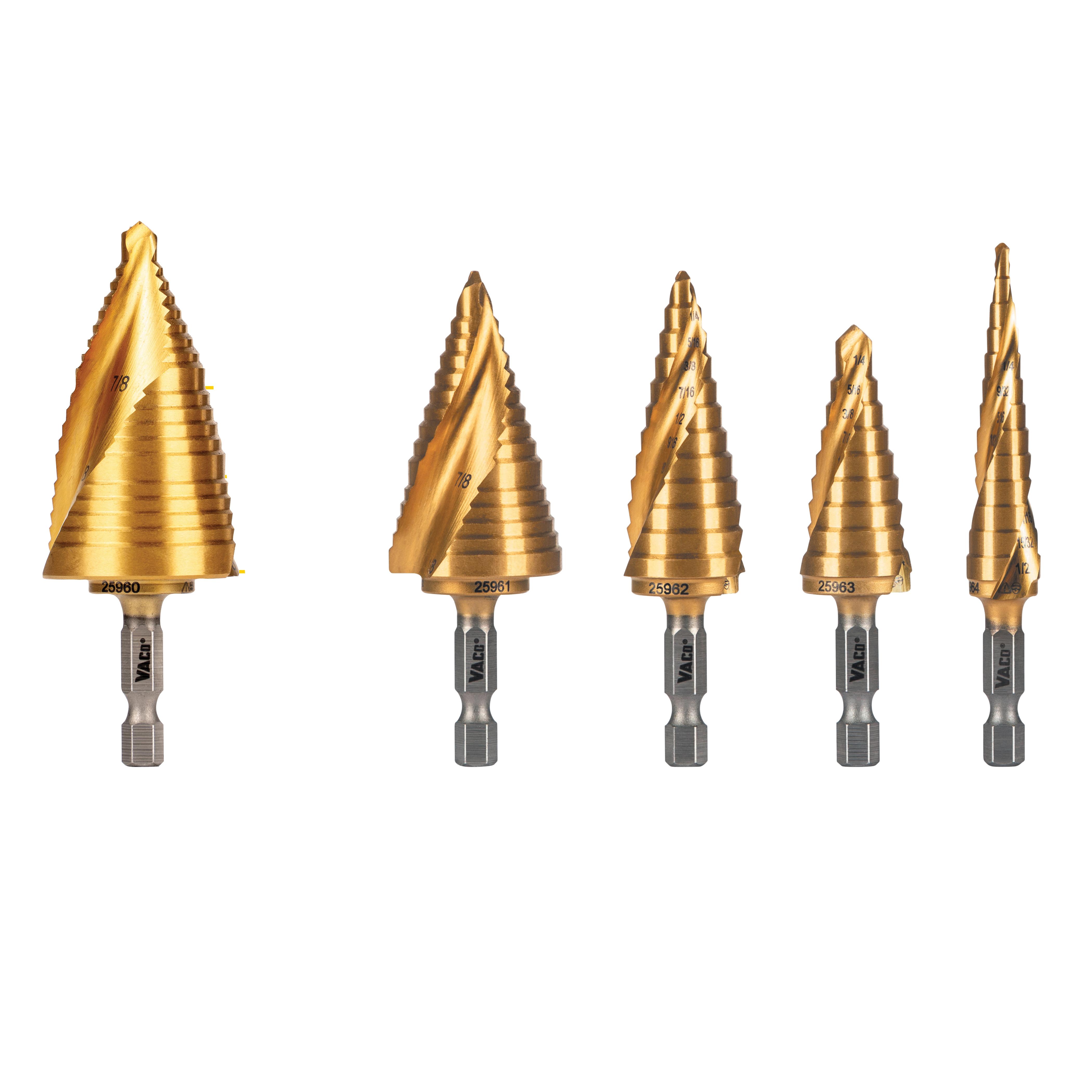 Dual Spiral Flutes on VACO Step Drill Bits help pull the step bit through material for faster cutting. The Titanium Nitride coating extends the life of the cutting edge. Convenient to use with an impact driver and drill, the 1/4-Inch hex shank provides a firm, positive grip. Available in five step bit sizes with commonly used hole sizes for steel (up to 16 gauge), plastic, aluminum, and wood.