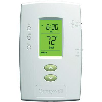 Honeywell Thermostat, PRO 2000 Series, 20 to 30 VAC, 750 mV, 0.02 to 1 A, 0.4 to 30 W Power, 50/60 Hz Frequency, Programmability: 5-2 day Program, Changeover: Manual, Dual Powered to Battery, Hardwired Power Source, 1 Heat/1 Cool Stages, Switch Position: HEAT-OFF-COOL (System), AUTO-ON (Fan), 1.73 sq-in Display, 40 to 90 deg F Heating, 50 to 99 deg F Cooling Settings, 5 to 90% RH Non-Condensing Humidity, Vertical Mounting, Cool Current: 0.02 to 1 A Running, Terminal Designation: R, C, W, Y, O/B, G, Heat Current: 0.02 to 1 A Running, Premier White, Dimensions: 4-11/16 in H x 2-7/8 in W x 1-1/8 in D