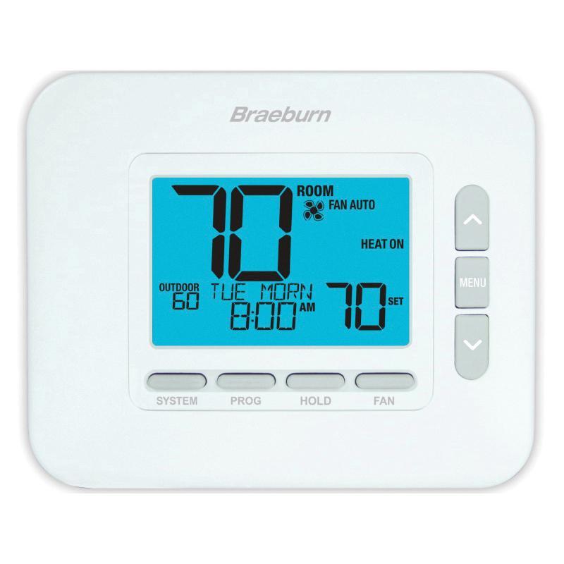 Braeburn® Programmable Thermostat With Dry Contact, Premier Series, 18-30 V, 3 V, 4 A, Programmability: 7 Day, No Programming, Changeover: Auto, Manual, Battery, Hardwired Power Source, 2 Heat, 1 Cool Heat Pump, 1 Heat, 1 Cool Stages, 4.4 sq-in Bright Blue Backlight Display, 0.5 deg F Fast, 1 deg F Medium, 2 deg F Fast Differential, 14 to 140 deg F, 5 to 95 % Humidity, +/-1 deg F Accuracy, Terminal Designation: Rc, Rh, W1/E, Y1, G, O/B/V3, C, S1, S2, DRY1, DRY2, Alkaline Battery, AA Battery, 45 to 90 deg F Control, Dimensions: 4.25 in H x 5.12 in W x 1 in D