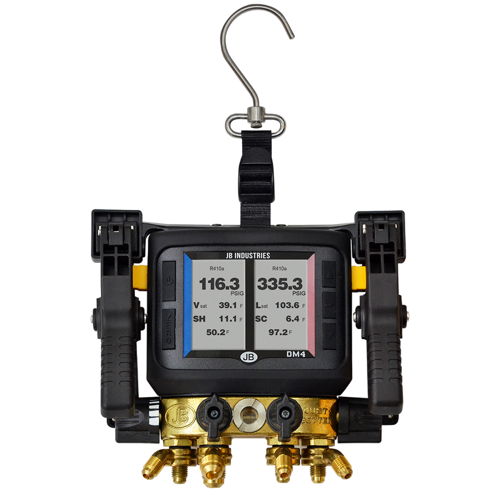 JB Industries REVOLVER™ 4-Valve Wireless Digital Manifold Set, 29 inHg to 800 psig Gauge, 1000 psi, -10 to 120 deg F, Brass, 14 in L x 13 in W x 8.5 in D