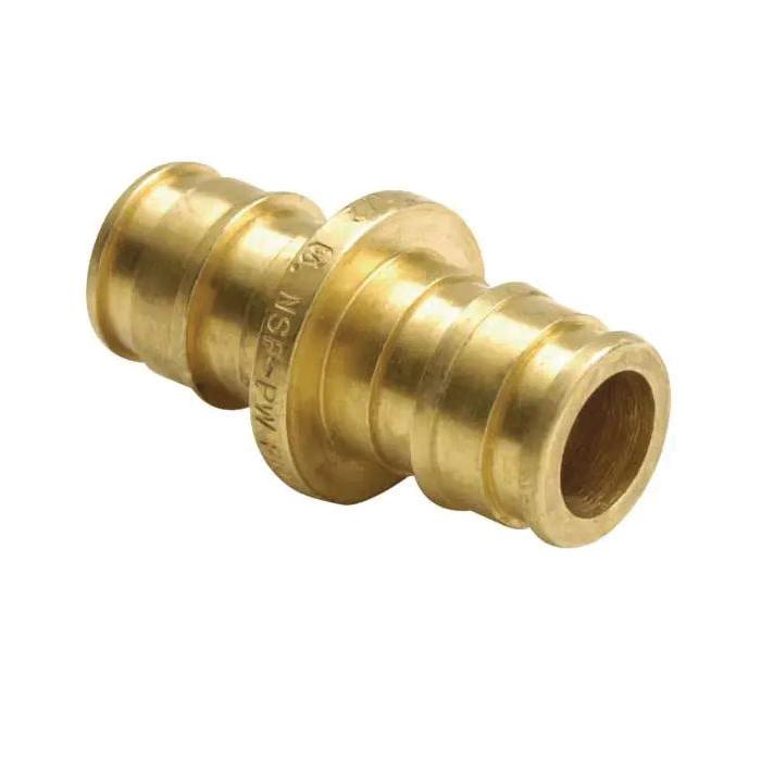 Uponor Coupling, Coupling Fitting, 3/4 in Connection Size 1, Connection Type 1: PEX, 1 in Connection Size 2, Connection Type 2: PEX, PEX|PEX Connection, Brass, Material Construction: Brass, 0.38 in Tube OD, 200 psi, 200 deg F