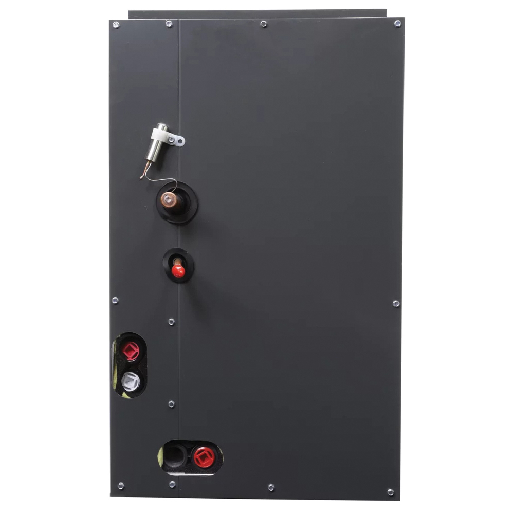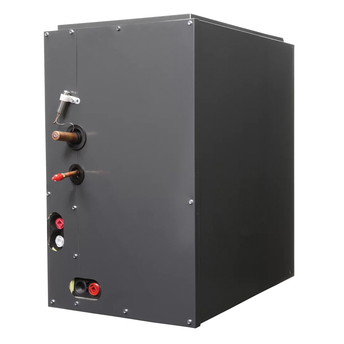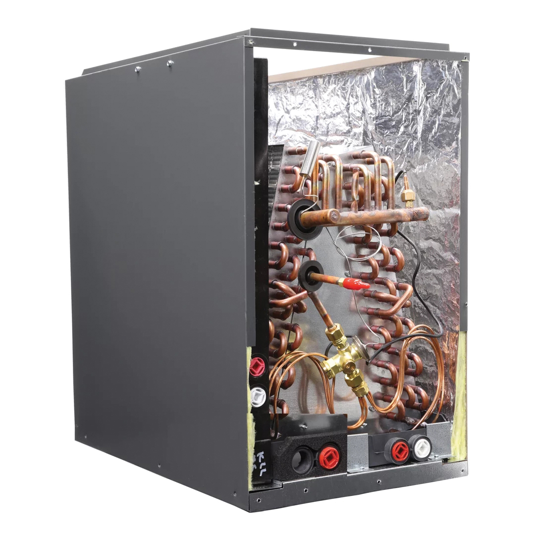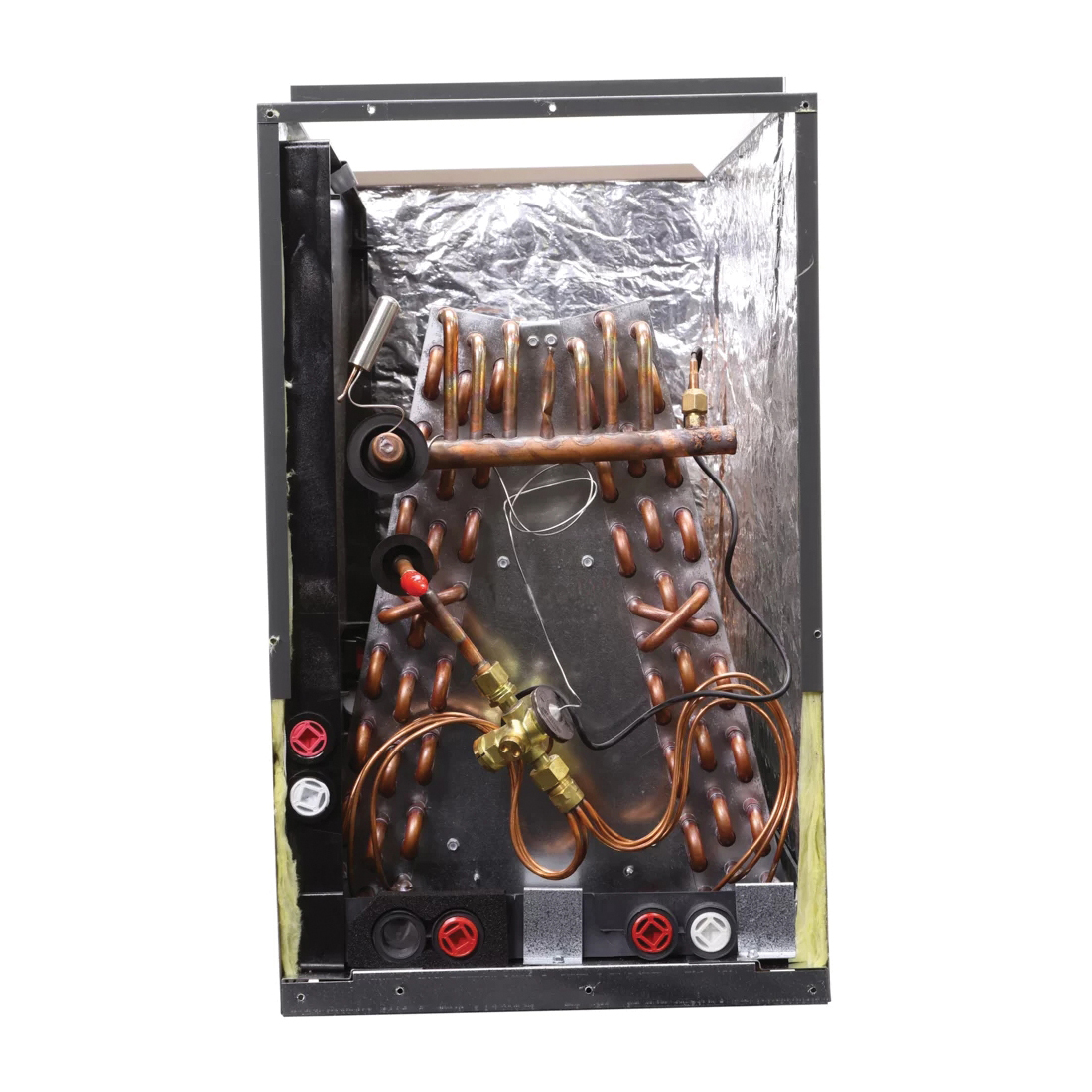 Refrigerant lines exit top of coil. Shrader valve on liquid line or internally mounted factory installed TXV for pressure assurance testing. Refrigerant and plumbing connections: