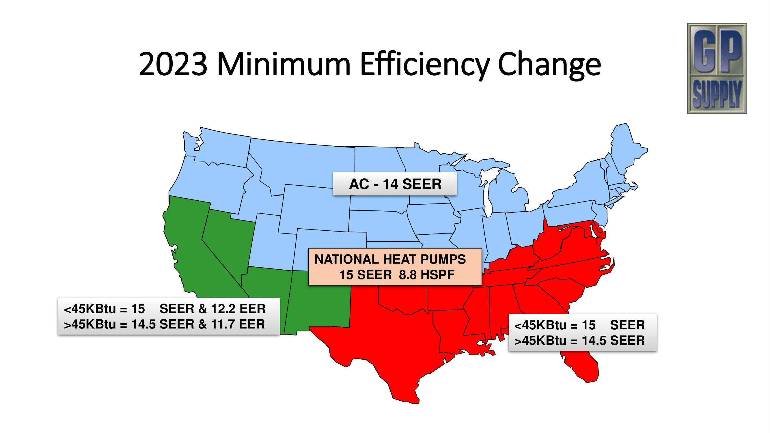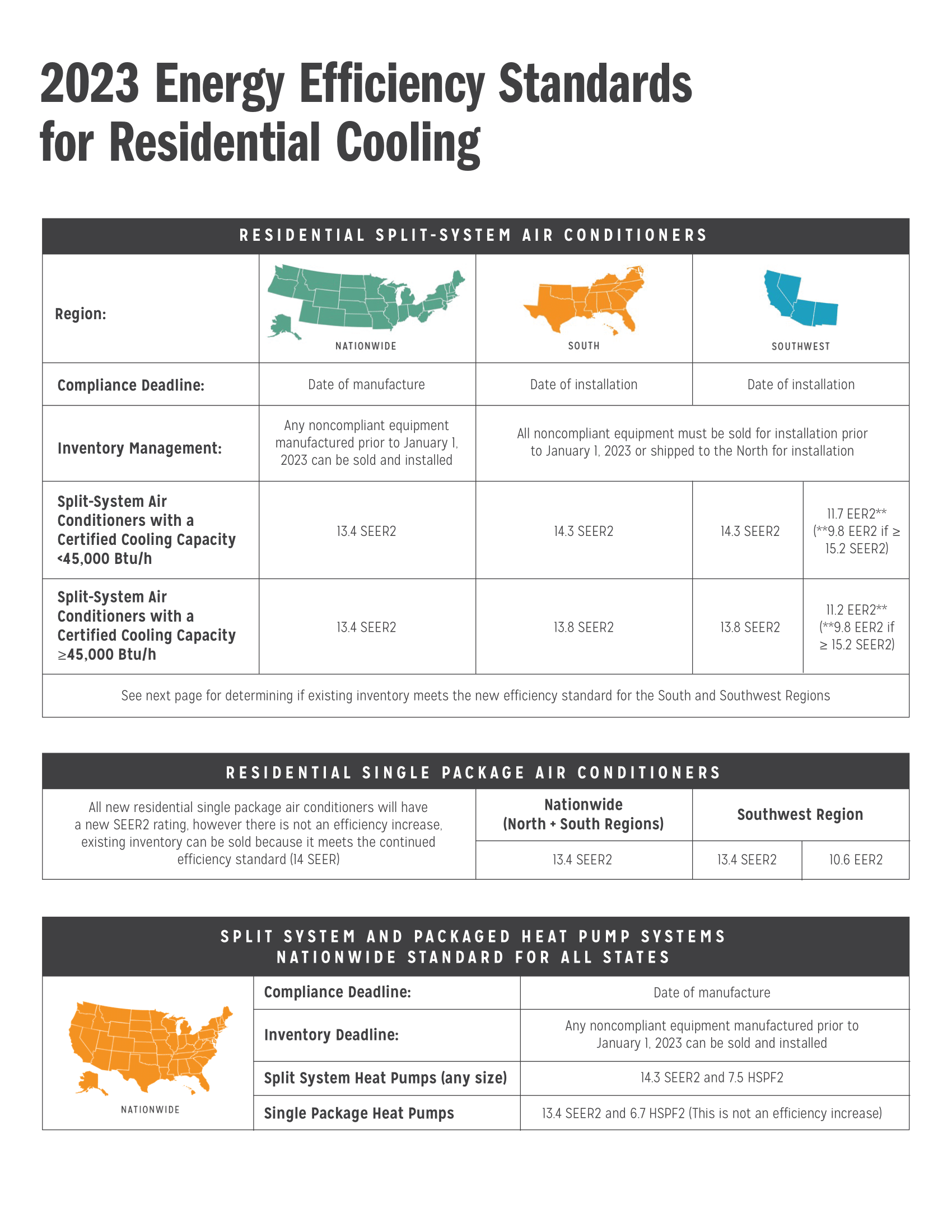 Starting on January 1, 2023, all residential air-conditioning and heat pump products are going through a change in how equipment efficiency is measured. This transition to SEER2 is accompanied by efficiency increases for split systems in air-conditioning and heat pumps. Heat pumps are going through a nationwide efficiency increase and split system air-conditioners are going through regional efficiency increases.