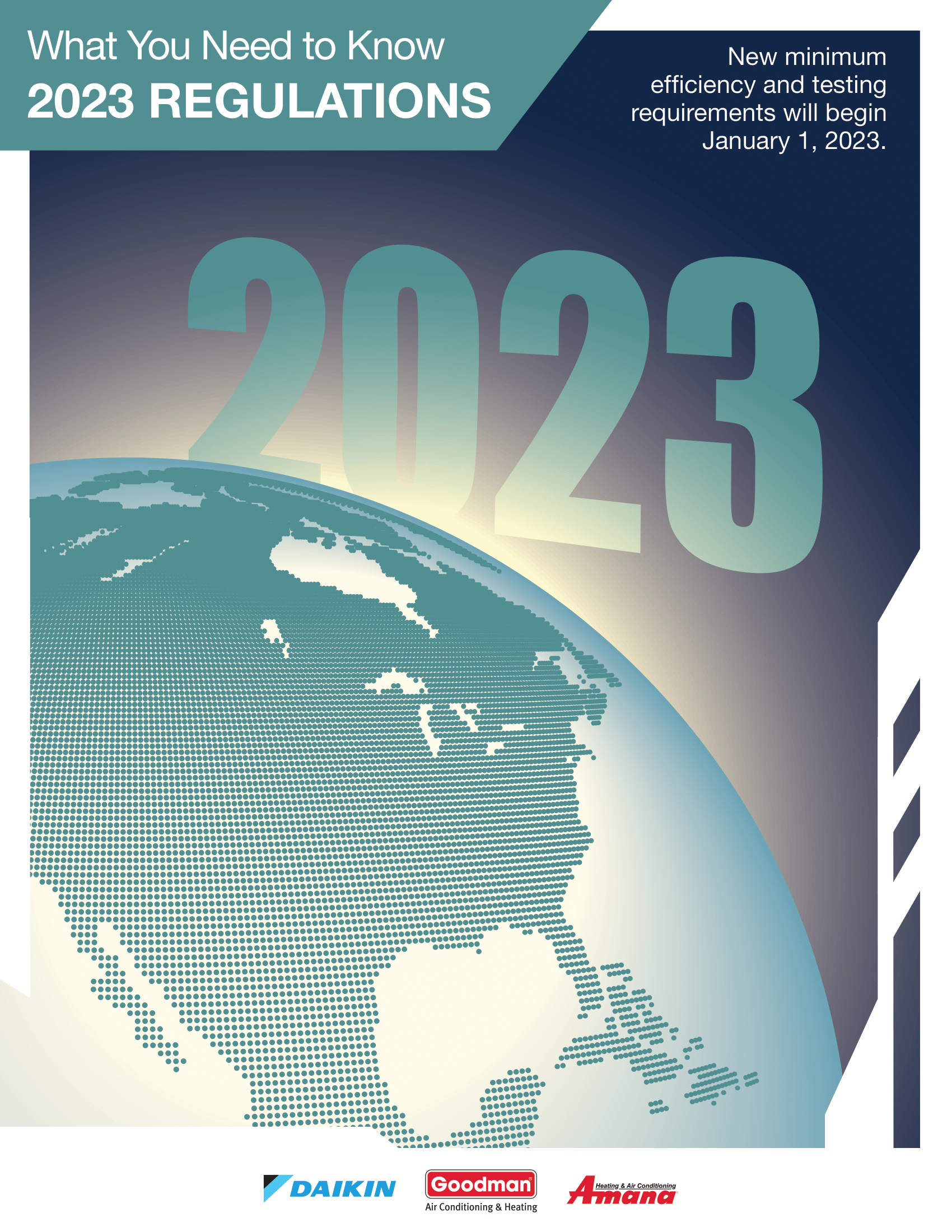 Summarization from Daikin and its family of brands of Department of Energy (DOE) regulations and requirements for 2023 new minimum energy efficiency standards. Includes 2023 minimum efficiency standards, new testing standards, regional compliance and non-compliance information, record keeping, and more.