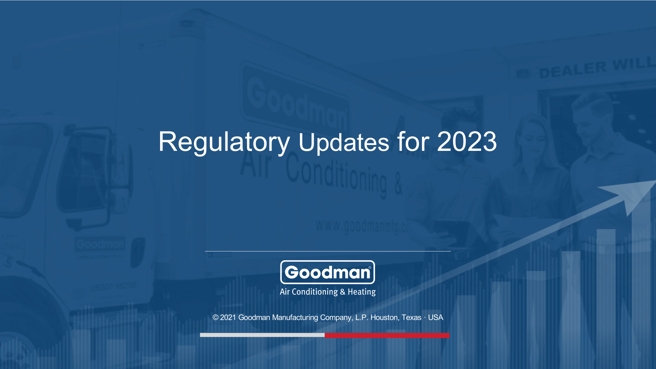 Regulatory updates for 2023 from Goodman including 2023 changes, DOE energy conservation standards for split AC 2023, historical regulatory changes, transition from UL-1995 to UL-60335-2-40, and future products in development.